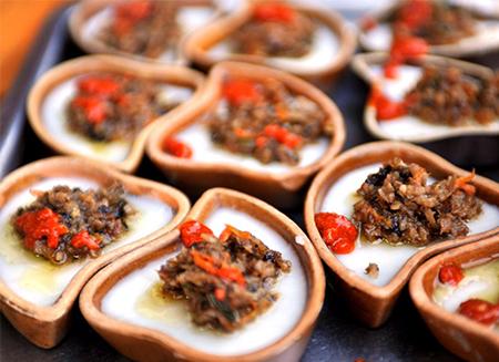 豆糕粿,是当地一种有名小吃。它是将大米磨成米浆,盛在一个个桃形的器皿里蒸熟,然后在上面添上经过油炸的菜脯粒而成的。白色的粿口感柔软,配上爆香的菜脯粒 , 十分可口。吃的时候,用一根头尖的竹签直接在上面划分一小块一小块,既方便、趣味又环保。